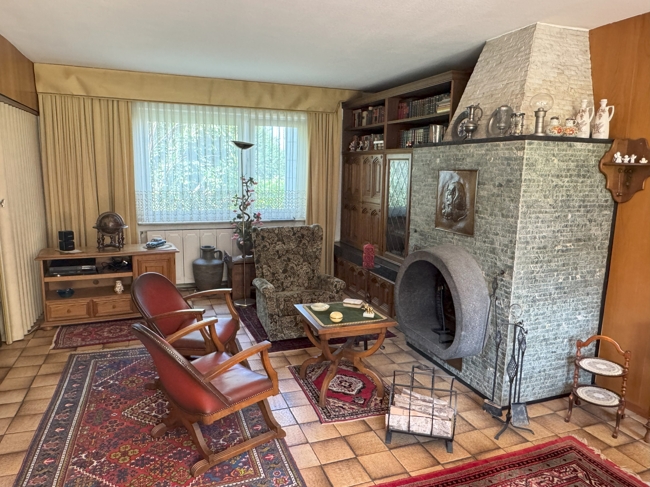 Von dort gelangt man in das große Wohn/-Esszimmer mit Kamin , die Küche