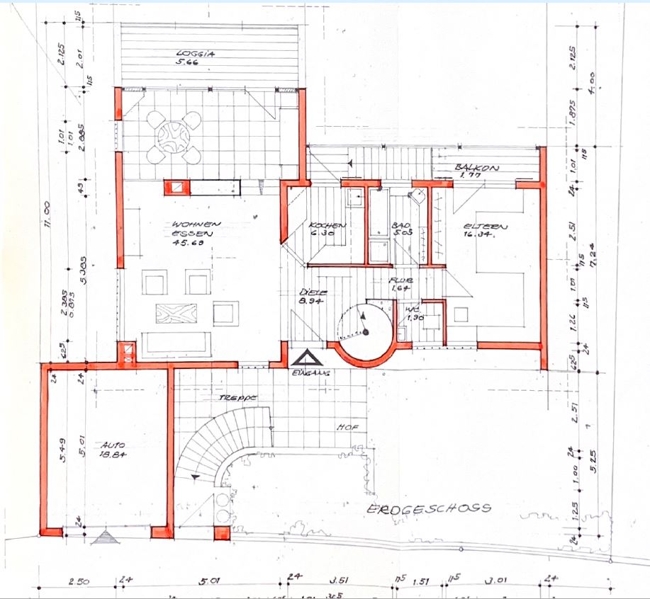 Dieses Anfang der 70er Jahre massiv gebaute Domizil war sicherlich ein besonderes Haus seiner Zeit. Bis in den Giebel ausgebaut, verfügt es über eine enorme Deckenhöhe. Die Bauweise in beachtlicher Hanglage war eine Herausforderung, die in der damaligen Zeit nicht alltäglich war.