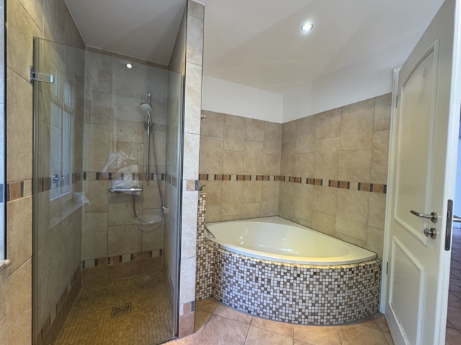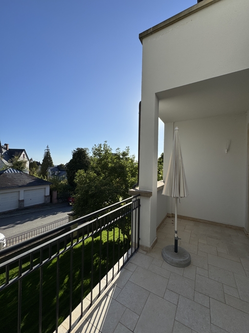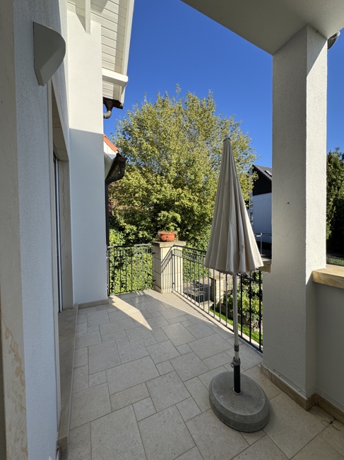 Der L-förmige Flur bringt uns dann in den privaten Bereich mit Bad, WC und drei üppigen Zimmern, wovon das Größte ebenfalls einen Balkon hat, auf dem man schon morgens die erste Tasse Kaffee geschützt genießen kann.