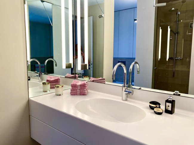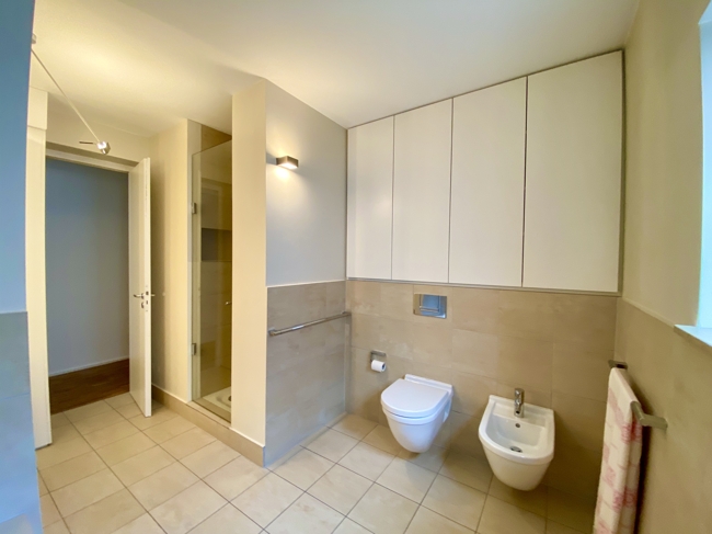Tageslichtbad mit Wanne und sep. Dusche, Toilette, Bidet & großem Spiegelschrank